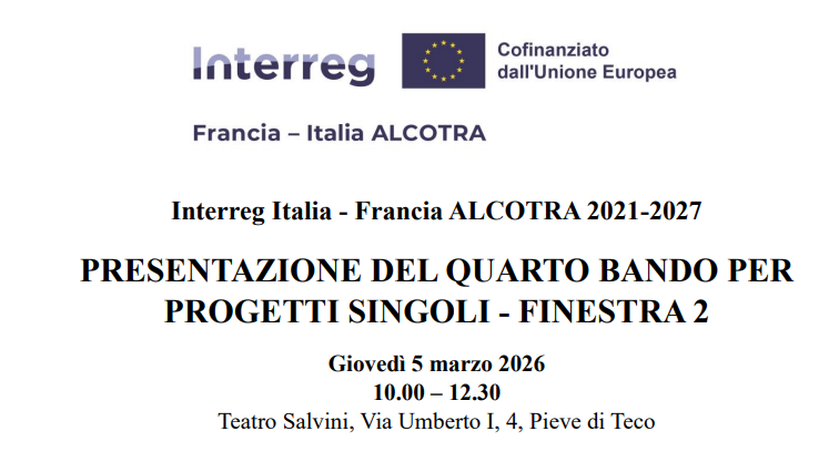 Giovedì 5 marzo alle ore 10 presso il Teatro Salvini di Pieve di Teco si terrà la presentazione del Quarto Bando per Progetti Singoli – Finestra 2 del Programma di Cooperazione Interreg Italia-Francia Alcotra 2021/2027.