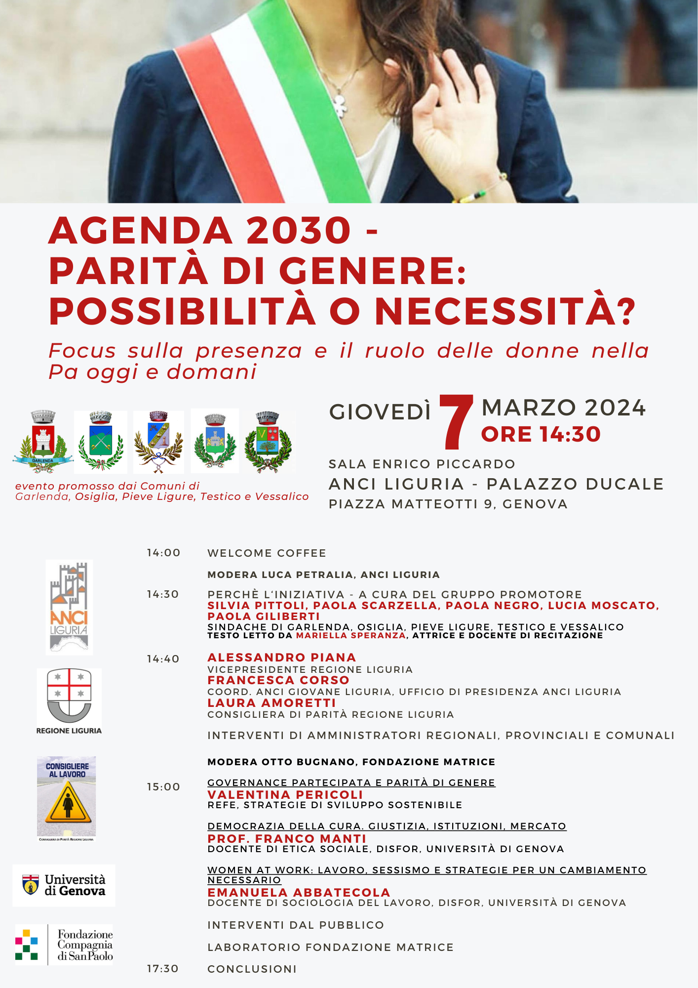 Giovedì 7 marzo 2024 a partire dalle ore 14.30 presso la sala Piccardo di Anci Liguria si terrà il convegno "Agenda 2030 - Parità di genere: possibilità o necessità? Focus sulla presenza e il ruolo delle donne nella Pa oggi e domani".