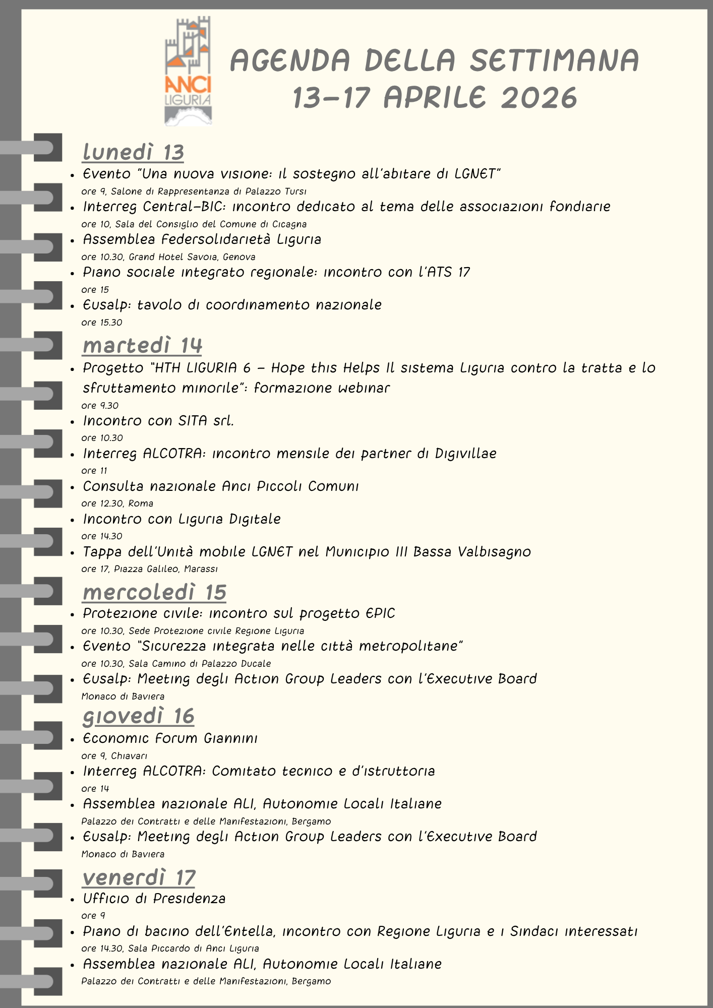 Agenda Anci Liguria della settimana 13-17 aprile 2026