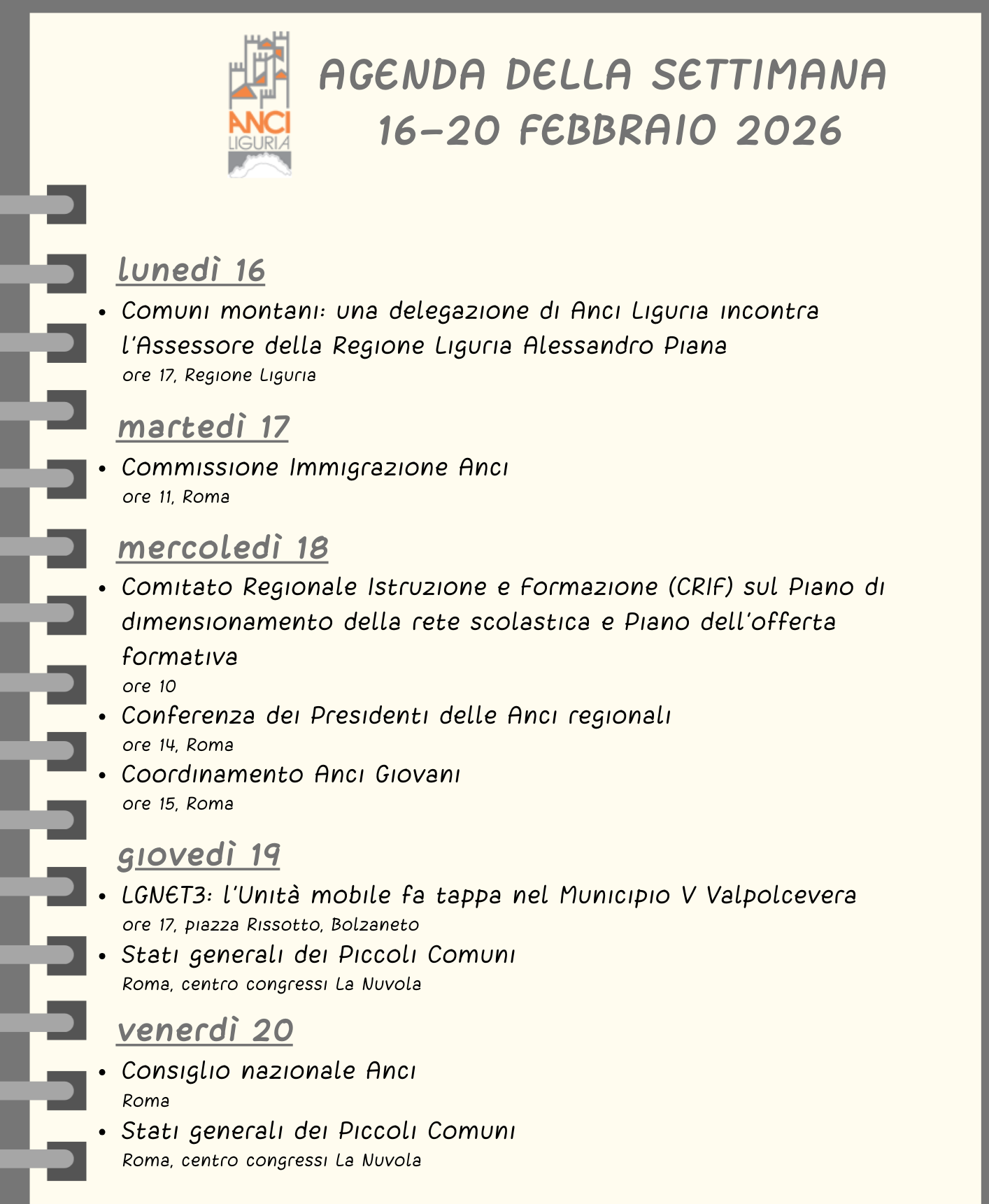 Agenda Anci Liguria della settimana 16-20 febbraio