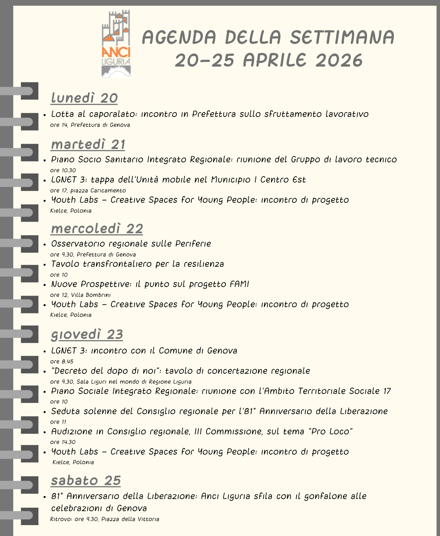 Agenda Anci Liguria della settimana 20-25 aprile 2026