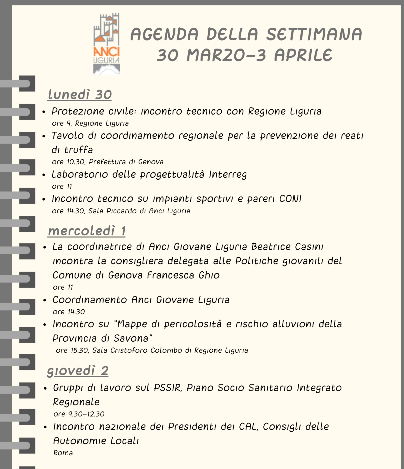 Agenda Anci Liguria della settimana 30 marzo-3 aprile 2026
