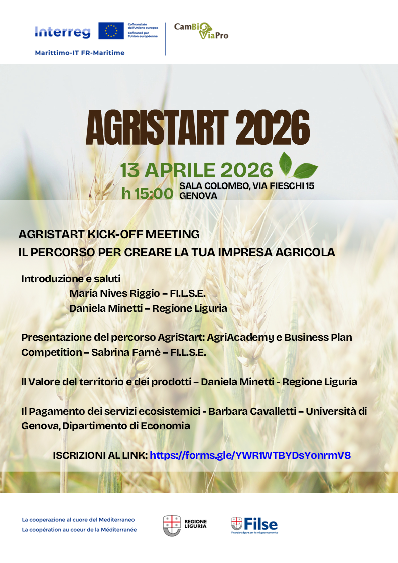 La Direzione Generale Agricoltura, Aree Protette e Natura è lieta di presentare l’iniziativa AGRISTART 2026, il percorso gratuito di accompagnamento alla creazione di impresa agricola, organizzata da FI.L.S.E. in collaborazione con Regione Liguria, nell’ambito del progetto Interreg IT-FR Marittimo “CAMBIOVIA-PRO - Tutela attiva della biodiversità tramite le comunità e l’economia sostenibile”.