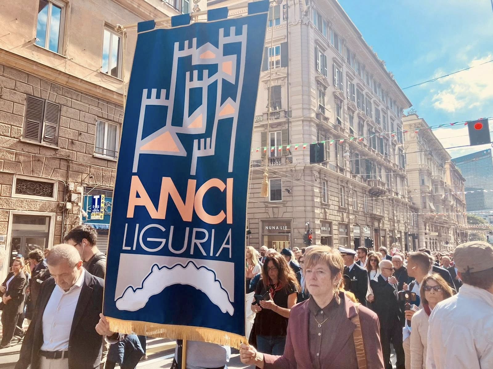 Il Direttore Pierluigi Vinai e la Direttrice reggente Annalisa Cevasco, in rappresentanza dei Comuni della regione, hanno scortato il gonfalone dell’Associazione lungo il corteo cittadino.