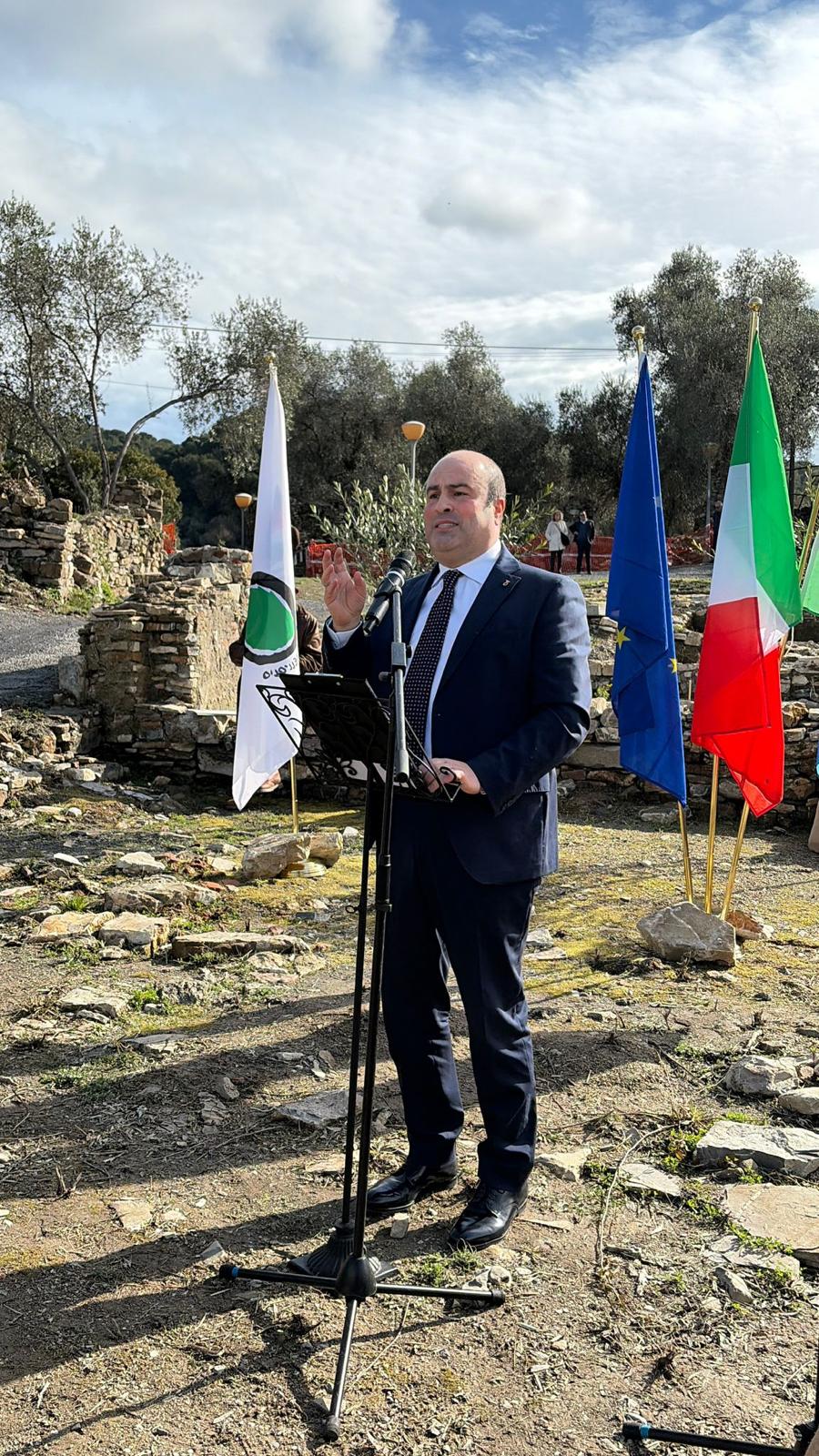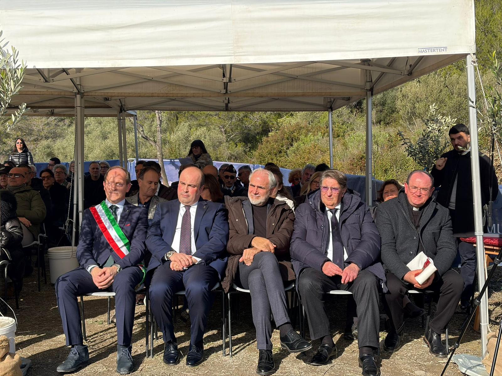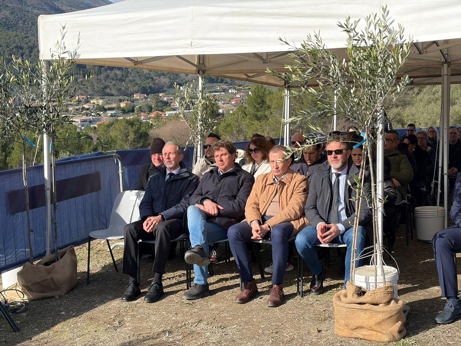 Al taglio del nastro dell’oliveto di Borgo Castello, insieme al Sindaco Mauro Demichelis, l’Assessore regionale all’Agricoltura Alessandro Piana, il Presidente nazionale dell’Associazione Città dell’Olio Michele Sonnessa, il Presidente della Camera di Commercio Riviere di Liguria Enrico Lupi, il direttore di Anci Liguria Pierluigi Vinai, il Vice Presidente di Anci Liguria Fabio Natta, il Presidente del Consiglio comunale con delega all’Agricoltura Flavio Marchiano, il Presidente della Fondazione Borgo Castello Corrado Siffredi, il Rup dirigente comunale dell’Area IV Borgo Castello, Architetto Nicola Maiorano e i rappresentanti della maggioranza, riuniti sulla terrazza panoramica del parco archeologico che si affaccia sulla collina olivata.