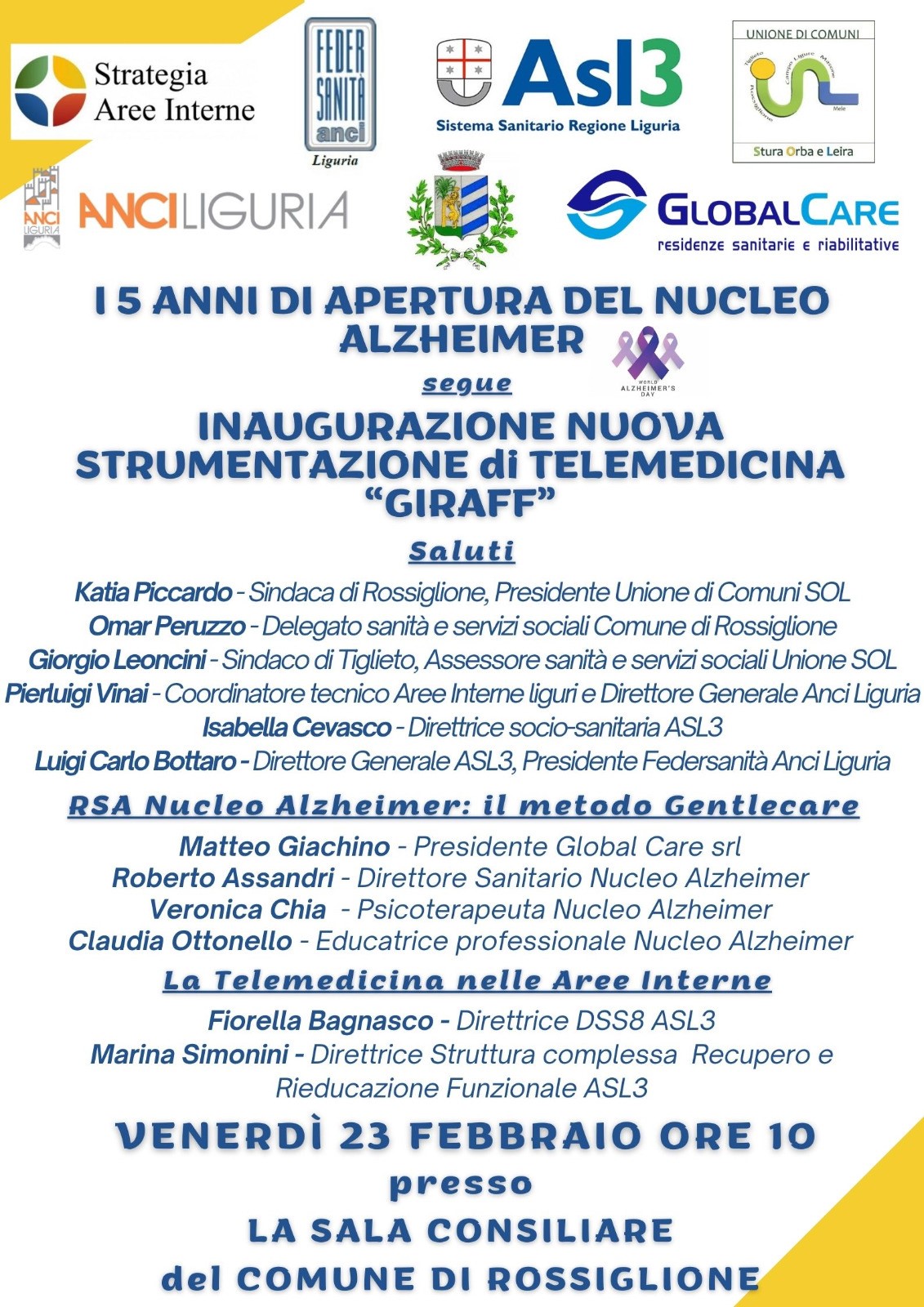 Venerdì 23 febbraio a partire dalle ore 10 presso la sala consiliare di Rossiglione si terrà l'evento patrocinato da Anci Liguria "I 5 anni di apertura del Nucleo Alzheimer", con inaugurazione della nuova strumentazione di telemedicina "GIRAFF".