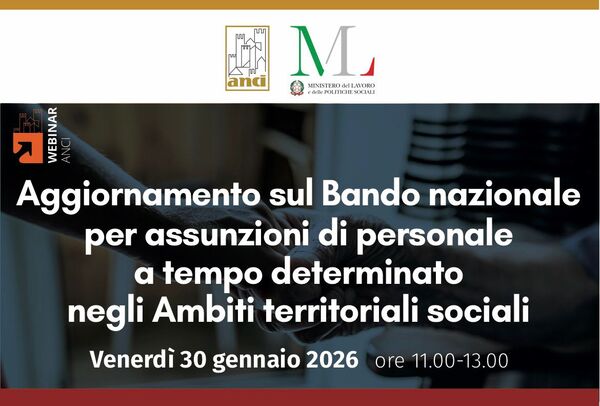 Venerdì 30 gennaio alle ore 11 si terrà il webinar "Aggiornamento sul bando nazionale per assunzioni di personale a tempo determinato negli Ambiti Territoriali Sociali", organizzato da Anci in collaborazione con il Ministero del Lavoro e delle politiche sociali, dedicato al bando di concorso nazionale per il reclutamento di 3.839 unità di personale da assumere con contratto a tempo pieno e determinato (36 mesi) presso gli ATS.
