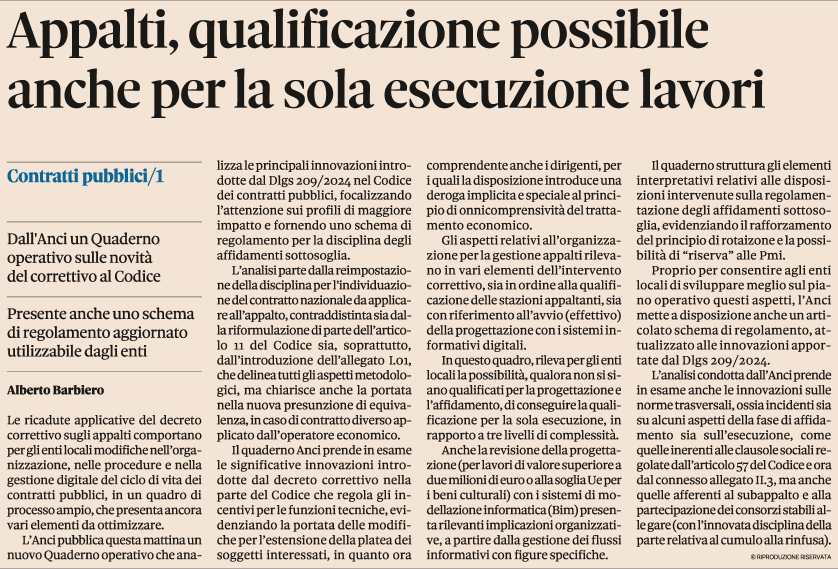 Disponibile il nuovo Quaderno Anci n. 55 “Decreto legislativo n. 209/2024 (Correttivo Appalti): prime linee guida operative e schema di regolamento per affidamenti sotto soglia aggiornato” sulle principali novità di interesse per Comuni e Città metropolitane.