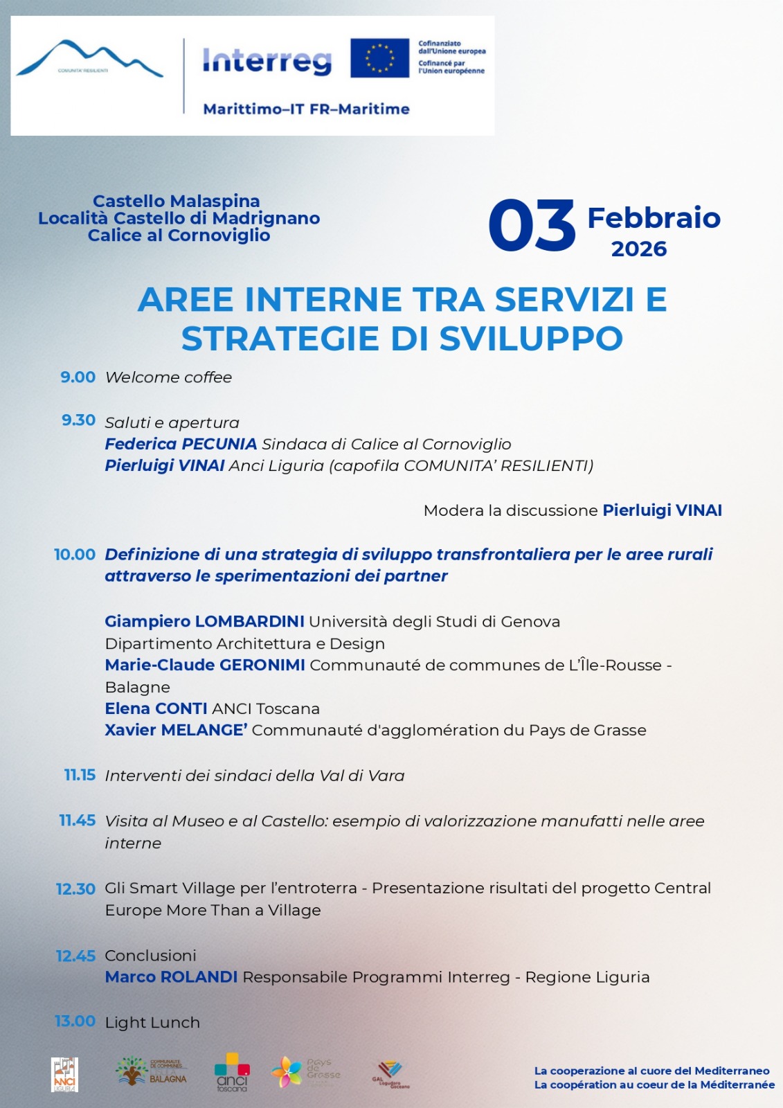 Pubblichiamo il programma dell'evento conclusivo del progetto Comunità Resilienti dal titolo "Aree interne tra servizi e strategie di sviluppo" che si terrà al Castello Malaspina, nel Comune di Calice al Cornoviglio martedì 3 febbraio 2026: