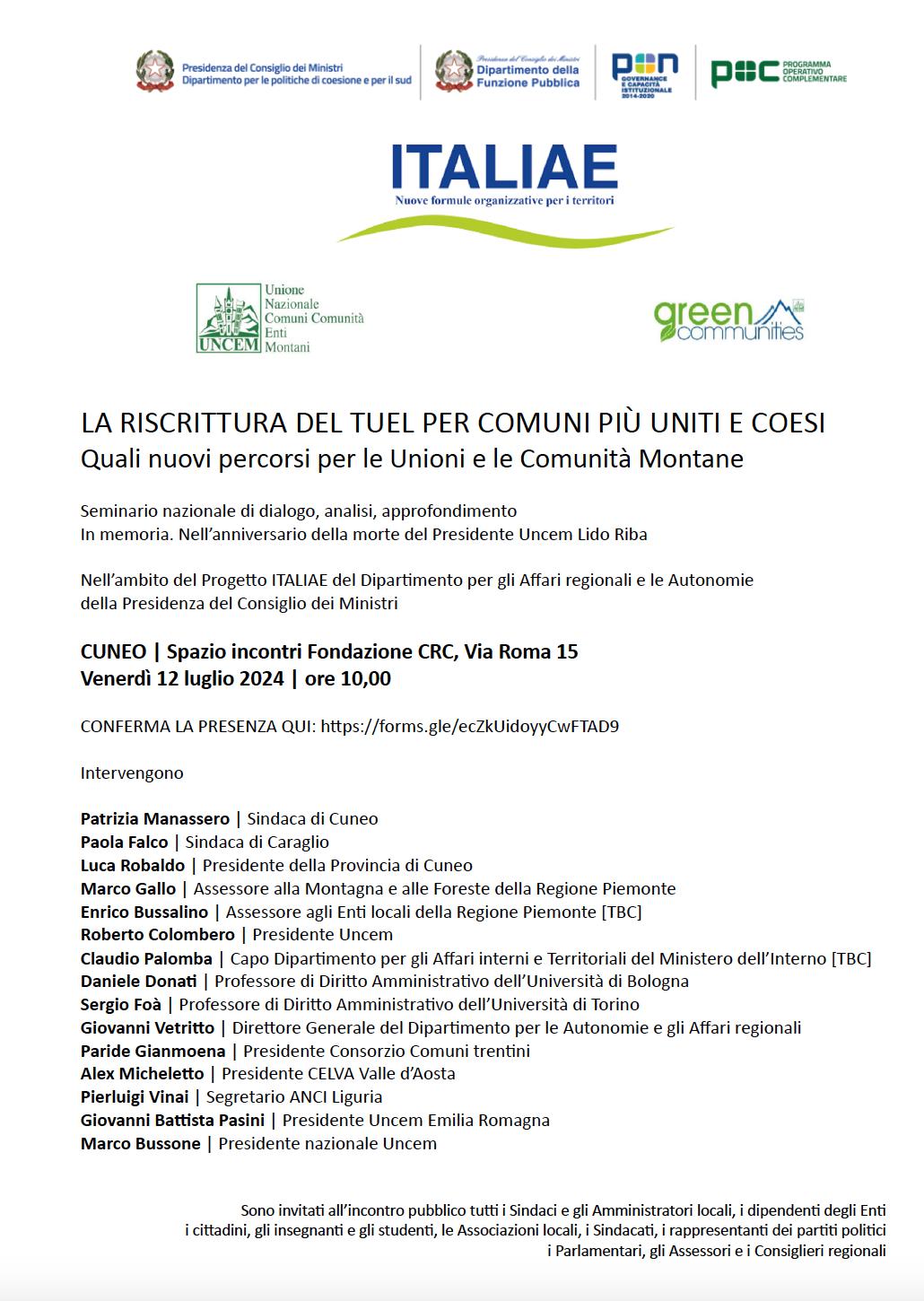 Venerdì 12 luglio a partire dalle ore 10 a Cuneo si terrà il convegno Uncem "La riscrittura del Tuel per Comuni più uniti e coesi. Quali nuovi percorsi per le Unioni e le Comunità montane".