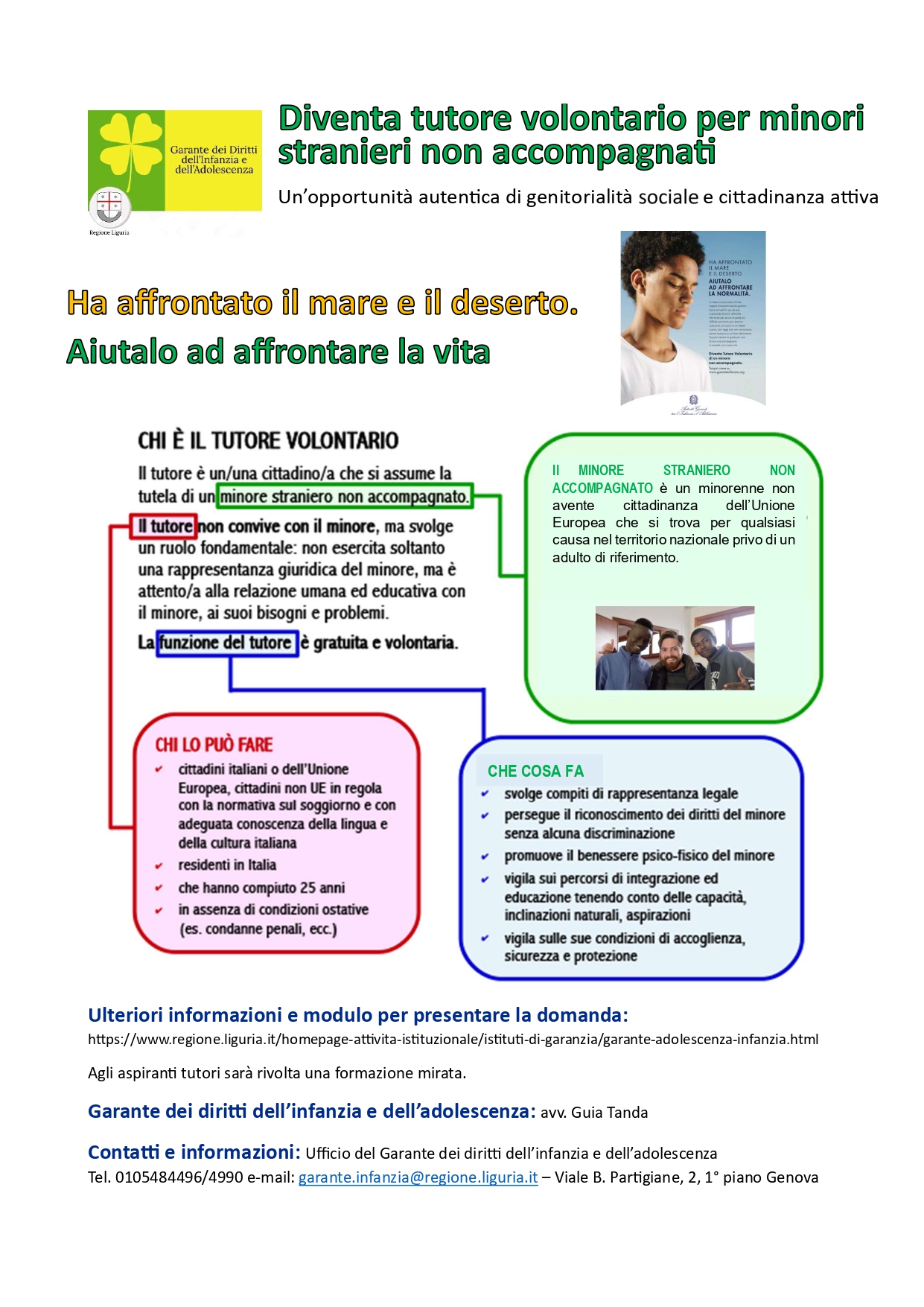 Anci Liguria ha avviato una collaborazione con il Garante dei Diritti dell’Infanzia e dell’Adolescenza della Regione Liguria Guia Tanda finalizzata alla promozione, presso i Comuni liguri, della figura del Tutore volontario di minori stranieri non accompagnati (msna).