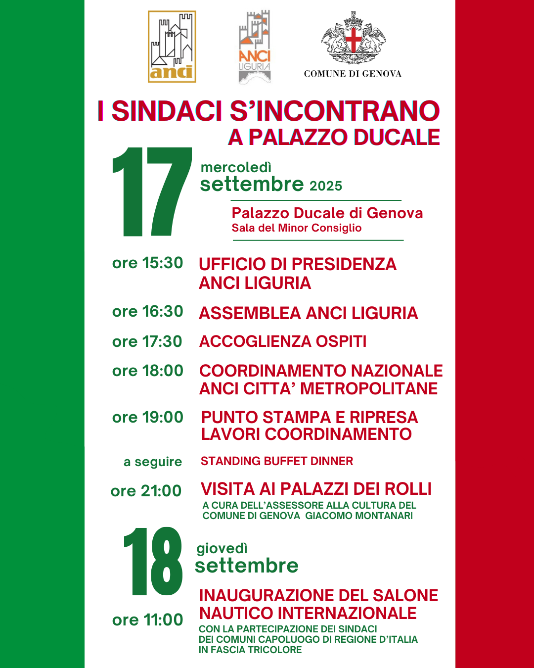 L'evento genovese s’inserisce in un contesto di grande rilevanza per la città. Dopo i lavori, i Sindaci parteciperanno a una visita guidata serale ai Palazzi dei Rolli, a cura dell'Assessore alla Cultura del Comune di Genova, Giacomo Montanari.