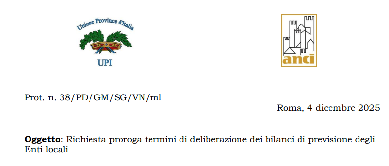 Anci e UPI hanno chiesto al Governo la proroga del termine per la deliberazione dei bilanci di previsione 2026-2028 degli Enti locali.