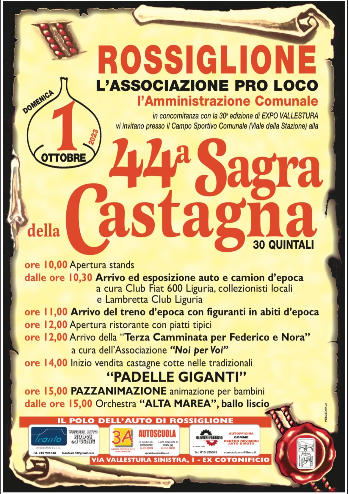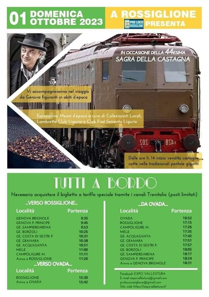 Domenica 1 ottobre, oltre all’esposizione di mezzi d’epoca, alle ore 11 arriverà il Treno storico con corteo di figuranti in abiti d’epoca; tappa di arrivo della terza camminata di beneficenza per Federico e Nora; nel pomeriggio la protagonista indiscussa sarà la castagna, frutto principe delle vallate con vendita di castagne cotte nelle tradizionali padelle giganti dagli esperti Valoi in costume caratteristico.