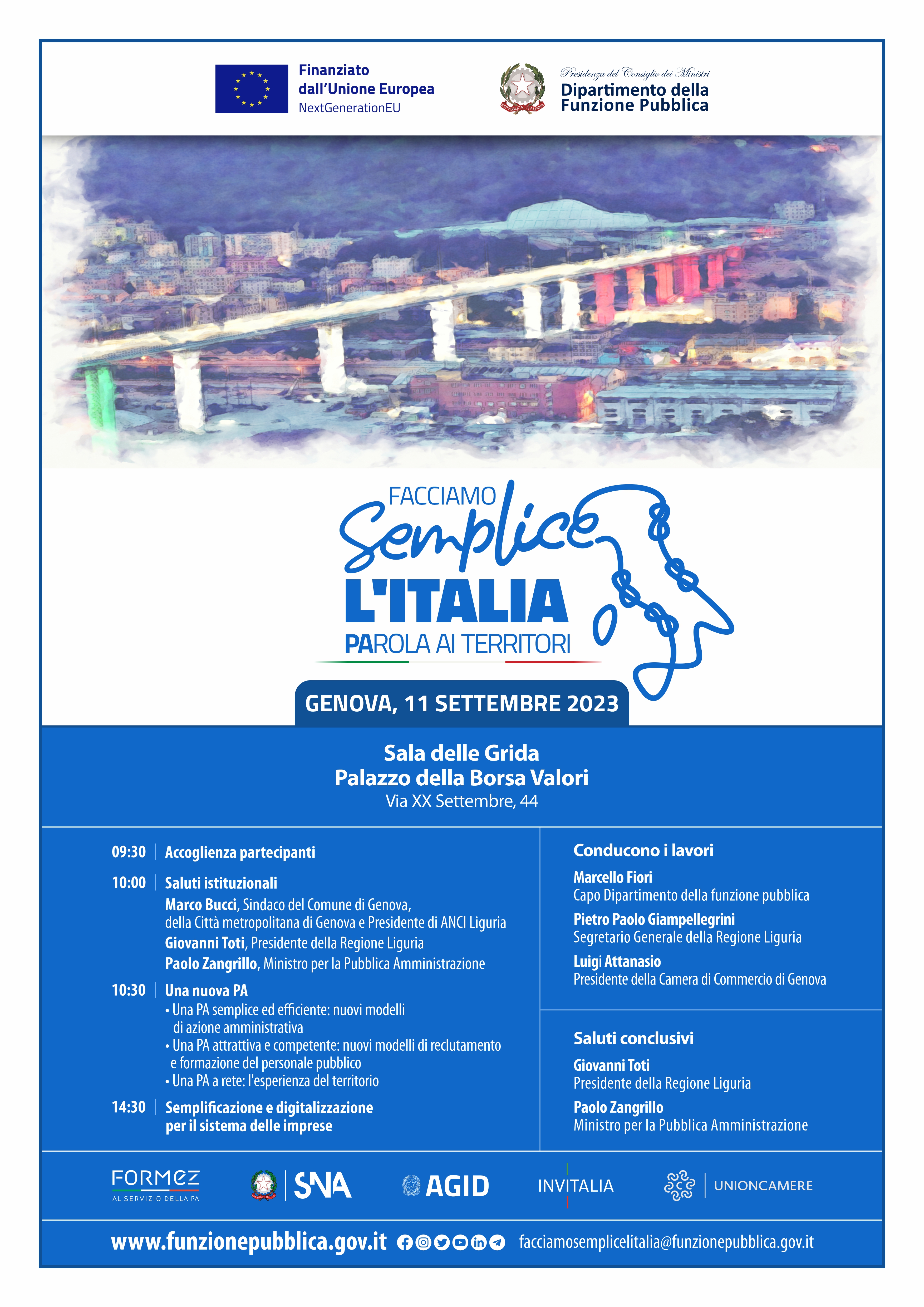 Semplificazione e digitalizzazione i temi scelti dal Dipartimento della Funzione Pubblica per l’incontro del Ministro Pa Paolo Zangrillo con istituzioni, amministratori pubblici, associazioni di categoria e imprese della Liguria:"Facciamo semplice l’Italia. PArola ai territori", fa tappa a Genova lunedì 11 settembre.