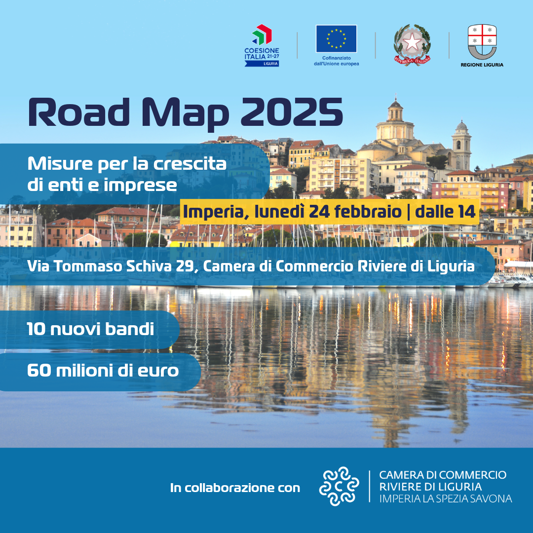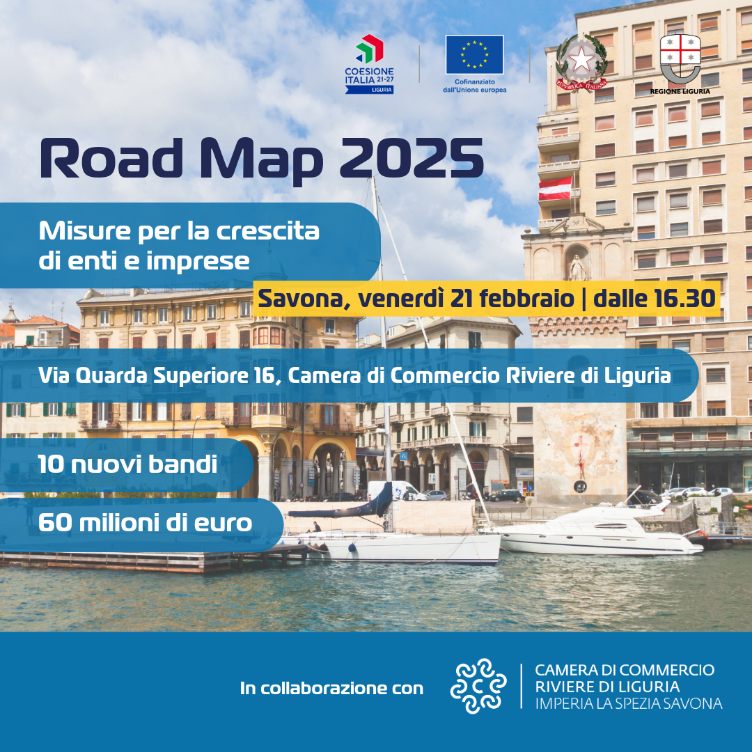 Partono gli eventi territoriali di Regione Liguria per la presentazione della "Road Map 2025", il nuovo calendario dei bandi Fesr 2021-2027 per enti e imprese: oltre 60 milioni di euro su 10 misure, che andranno a sostenere gli investimenti di Comuni e aziende, con l’obiettivo di generare investimenti stimati in circa 100 milioni di euro.