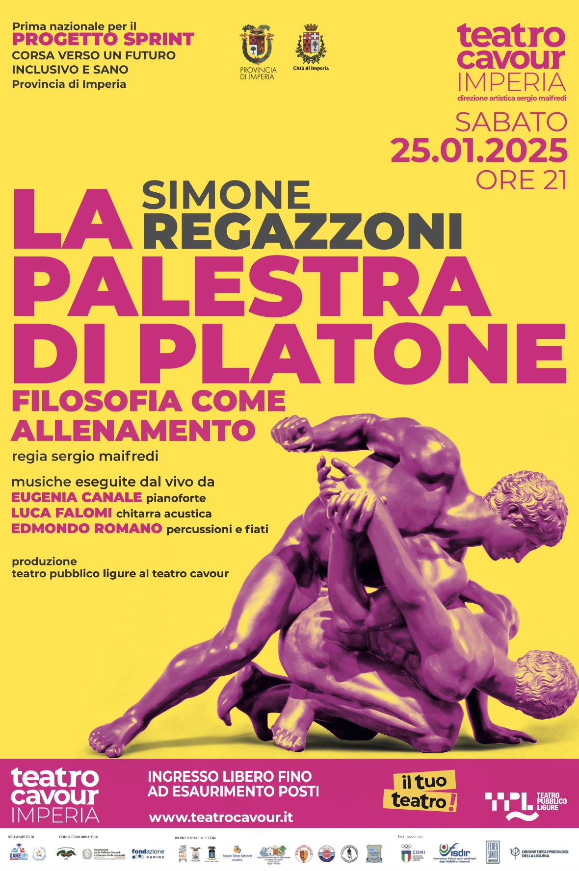"La Palestra di Platone", prodotto da Teatro Pubblico Ligure con la regia di Sergio Maifredi, coniuga parola, musica e immagini. Lo spettacolo è tratto dall’omonimo libro di Simone Regazzoni, edito da Ponte alle Grazie, che ne è autore e protagonista. Il racconto spazia dall’antica Grecia fino ai moderni atleti contemporanei, con particolare attenzione all’alimentazione come base per il benessere psicofisico. La musica è eseguita dal vivo da Eugenia Canale al pianoforte, Luca Falomi alla chitarra acustica, Edmondo Romano alle percussioni e ai fiati.