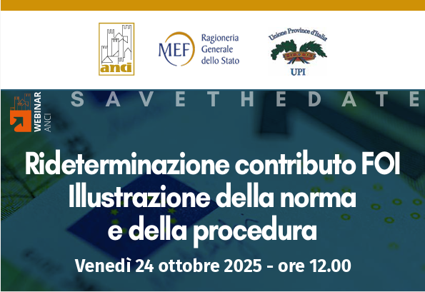 Si terrà venerdì 24 ottobre 2025 alle ore 12:00 il webinar Anci, UPI e MEF dedicato alla rideterminazione del contributo FOI (Fondo Opere Indifferivili). L’incontro avrà l’obiettivo di illustrare agli enti il perimetro di applicazione della norma e le funzionalità operative della procedura.