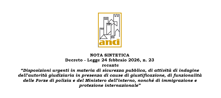 Pubblichiamo la nota sintetica Anci al Decreto – Legge 24 febbraio 2026, n. 23 “Disposizioni urgenti in materia di sicurezza pubblica, di attività di indagine dell’autorità giudiziaria in presenza di cause di giustificazione, di funzionalità delle Forze di polizia e del Ministero dell’interno, nonché di immigrazione e protezione internazionale”.