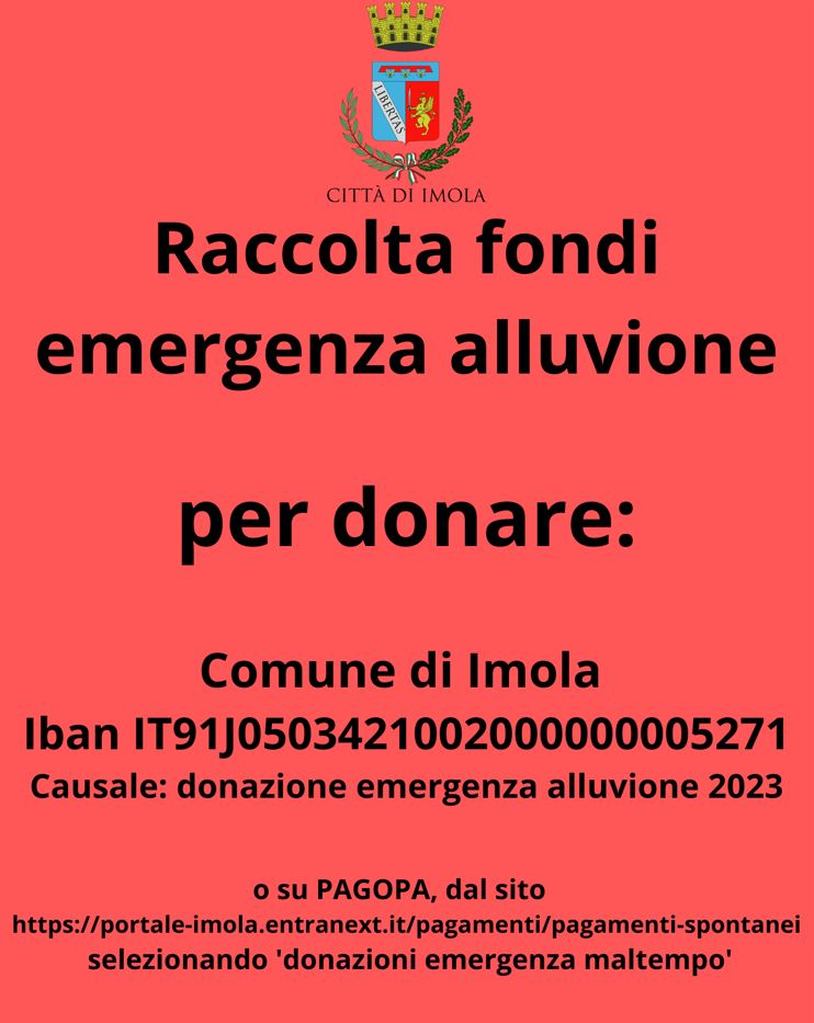Il Comune di Imola ha avviato una raccolta fondi per fronteggiare l'emergenza alluvione: in allegato i dati necessari per donare.