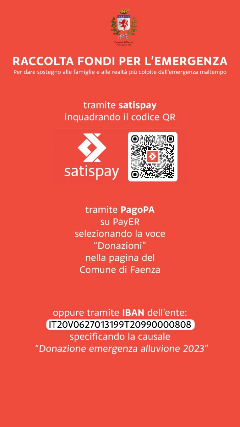 Il Comune di Faenza, una delle città più colpite dalle alluvioni dall’inizio del mese, ha pubblicato qui i dettagli per chi vuole fare una donazione con bonifico, Satispay o PagoPaxf.
