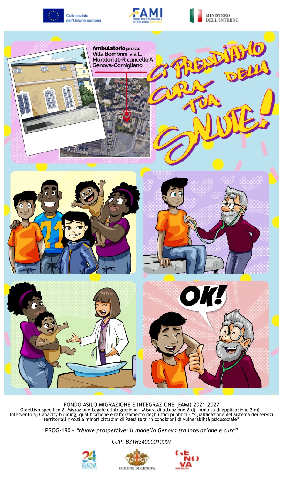 Disponibile l'ultimo prodotto comunicativo di Anci Liguria per la promozione delle attività del progetto FAMI (Fondo Asilo, Migrazione e Integrazione) "Nuove prospettive: il modello Genova tra interazione e cura": un'infografica, realizzata per offrire un approfondimento particolareggiato, ma di immediata comprensione, sui servizi offerti dall'ambulatorio sperimentale di presa in carico sanitaria e socio-sanitaria dei minori stranieri non accompagnati di Villa Bombrini.