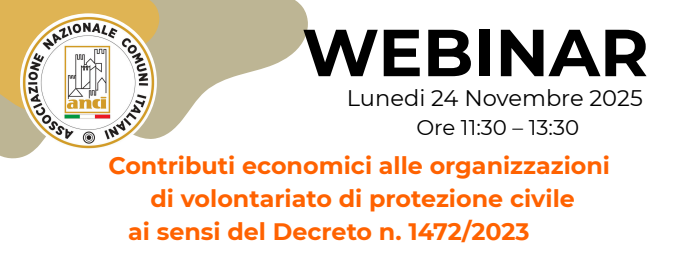 Lunedì 24 novembre a partire dalle ore 11.30 si svolgerà il webinar "Contributi economici alle organizzazioni di volontariato di protezione civile ai sensi del Decreto n. 1472/2023".
