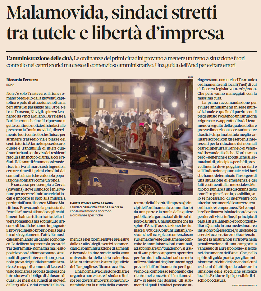 La cosiddetta“malamovida”, vale a dire l’eccessiva pressione che grava su alcune aree delle nostre città, in particolare nei centri storici, a causa della concentrazione di locali e attività di intrattenimento di diversa natura, che attirano una moltitudine di persone, rappresenta un fenomeno delicatissimo, la cui regolazione investe profili, poteri e competenze istituzionali diverse, in relazione allo specifico interesse pubblico tutelato: salute, pubblica quiete, decoro, igiene urbana e vivibilità dei territori, nonché ordine e sicurezza pubblica.