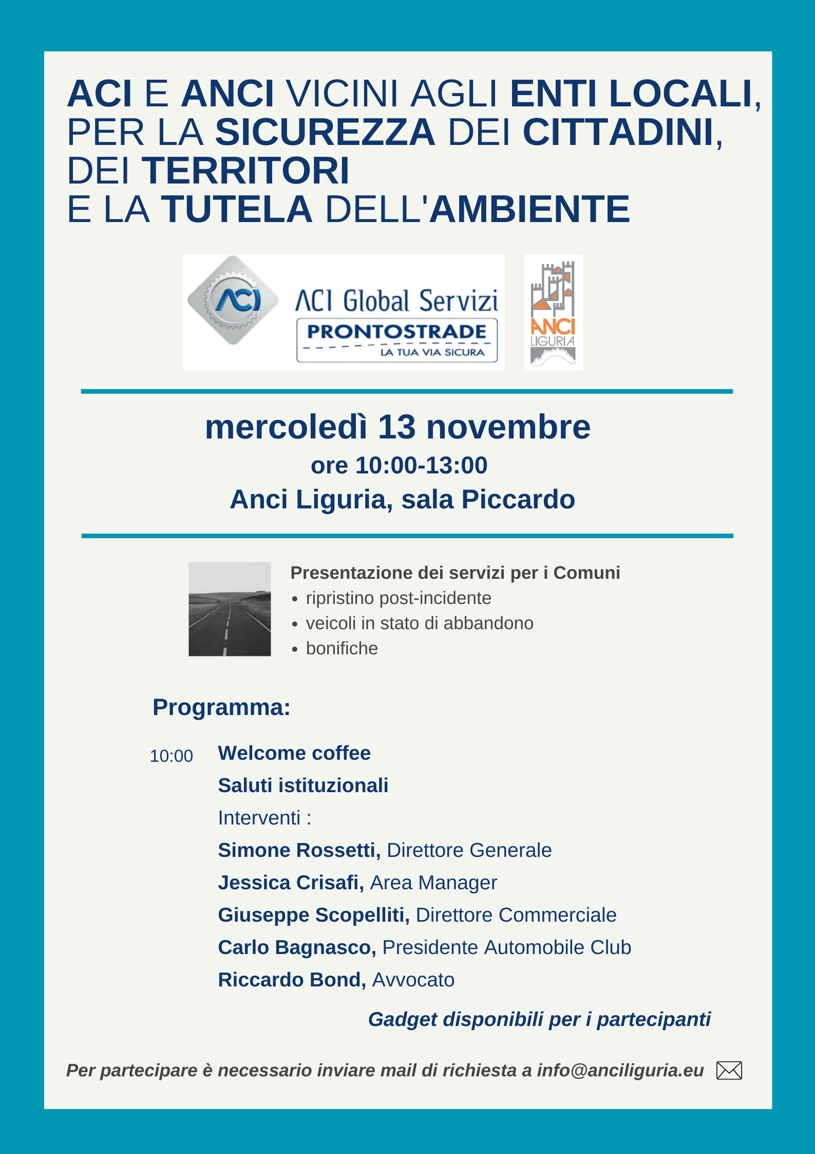 Mercoledì 13 novembre dalle ore 10 alle 13 presso la sala Piccardo di Anci Liguria si terrà l'evento "Aci e Anci vicini agli enti locali, per la sicurezza dei cittadini, dei territori e la tutela dell'ambiente".