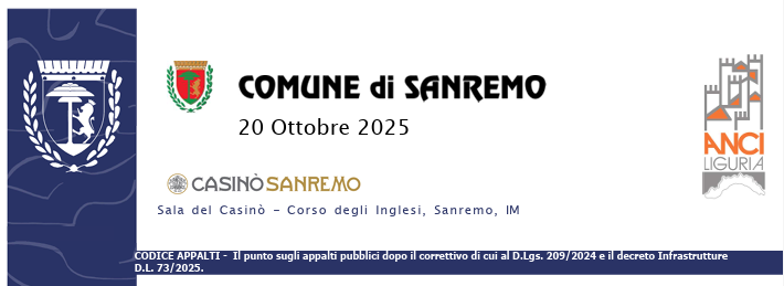 Lunedì 20 ottobre 2025 si terrà a Sanremo un seminario gratuito in presenza, presso la sala del Casinò, sul tema del nuovo Codice degli Appalti, con un focus particolare sul correttivo al D.Lgs. 209/2024 e il D.L. Infrastrutture 73/2025.